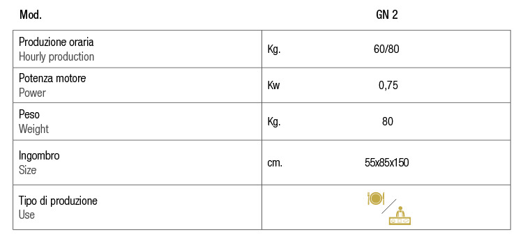 GN2 kolayca çıkarılabilir ve bu, daha hızlı temizleme işlemlerine olanak tanır. Şekillendirme bloğunun hızlı değiştirilebilirliği sayesinde klasikten küçük taşlara kadar farklı çaplarda gnocchi üretmek ve dolayısıyla üretimi optimize etmek ve çeşitlendirmek mümkündür. Hamurla temas eden parçalar, doğru ve hızlı temizliği kolaylaştırmak için tamamen çıkarılabilir ve korozyona karşı tam garanti sunan gıda malzemeleri ile yapılır. Gnoccatrice tekerlekli.