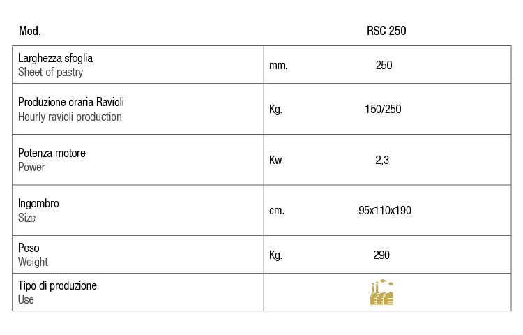 - Aynı üretim döngüsünde çeşitli formatların üretimi için özellikle uygun hale gelen ravioli makinesinin kullanımında aşırı esneklik sağlayan, format değişimi için kalıpların birkaç saniye içinde hızlı bir şekilde bağlanması