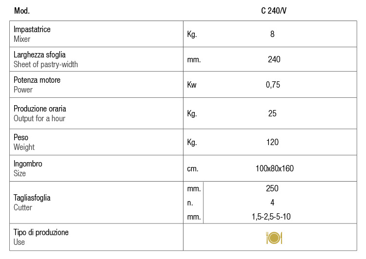 - cm genişliğinde hamur açma makinesi. 24 0 ila 4 mm kalınlıkta ayarlanabilir, profesyonel bir laminasyon için yeterli boyutta, hamuru herhangi bir stres olmadan çalıştırmanıza izin verir, bunun sonucunda aşırı ısınmayı önler, ideal organoleptik niteliklere sahip bir tabakayı garanti eder. Bakım ve yağlamayı önlemek için rulmanlara monte edilmiş kalibre silindirleri